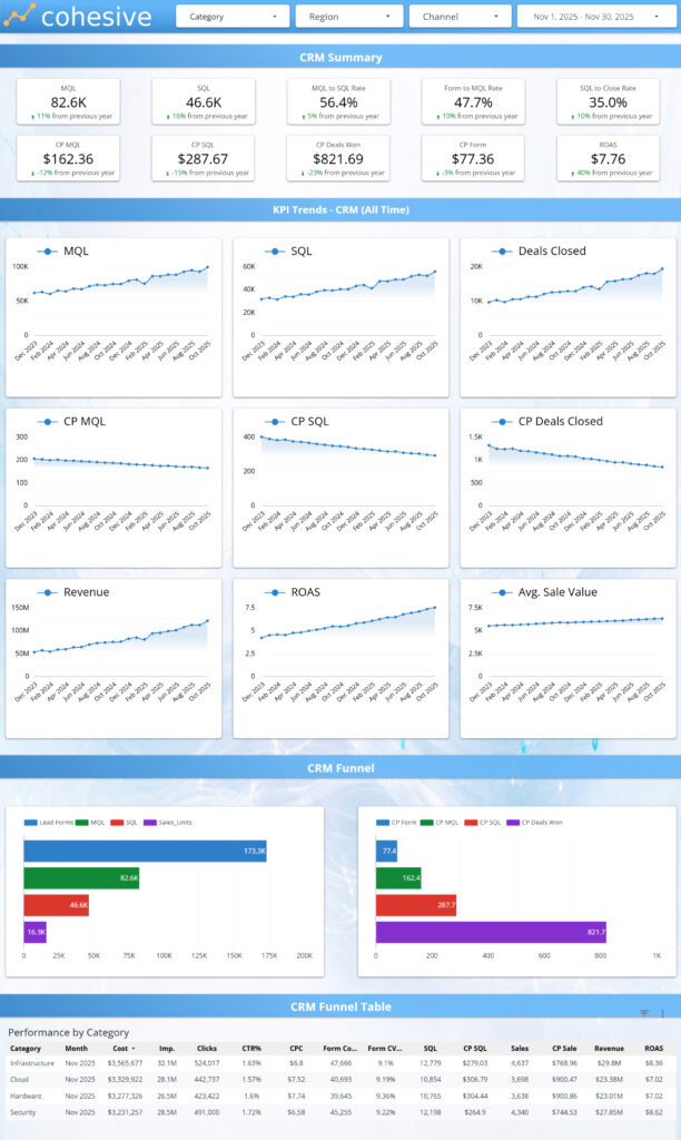 This tab tracks how CRM performance evolves over time, following qualified demand from MQLs through SQLs, closed deals, and revenue. The trend tiles pair volume metrics (MQLs, SQLs, deals) with efficiency and value indicators (cost per stage, ROAS, average sale value), allowing pipeline momentum and quality to be evaluated together.