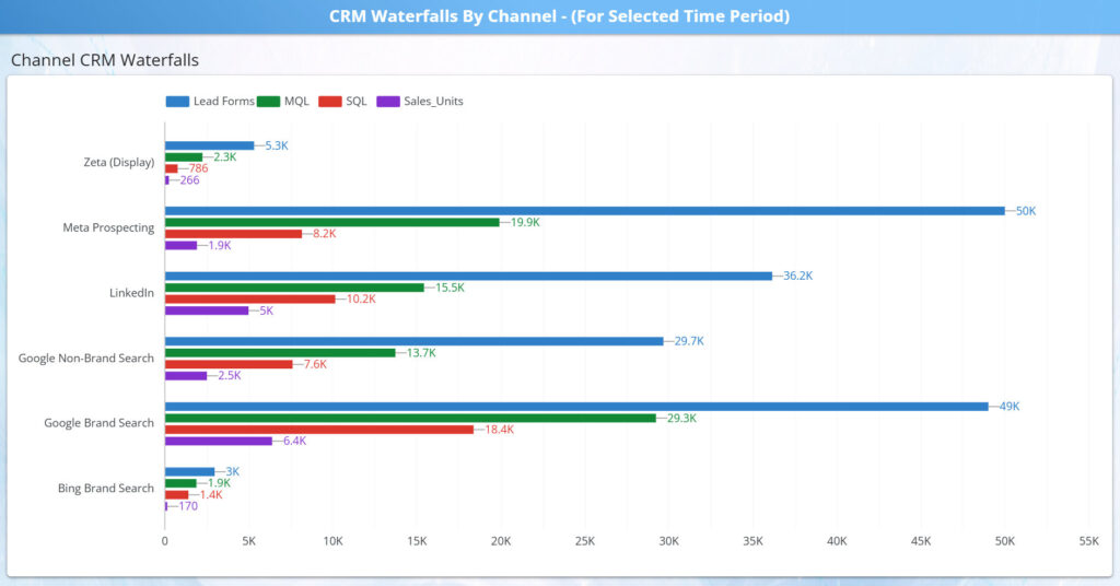 This waterfall compares how each channel progresses through the CRM funnel, from lead forms to MQLs, SQLs, and closed sales. By showing each stage side by side, it makes downstream performance differences across channels immediately visible for the selected time period.