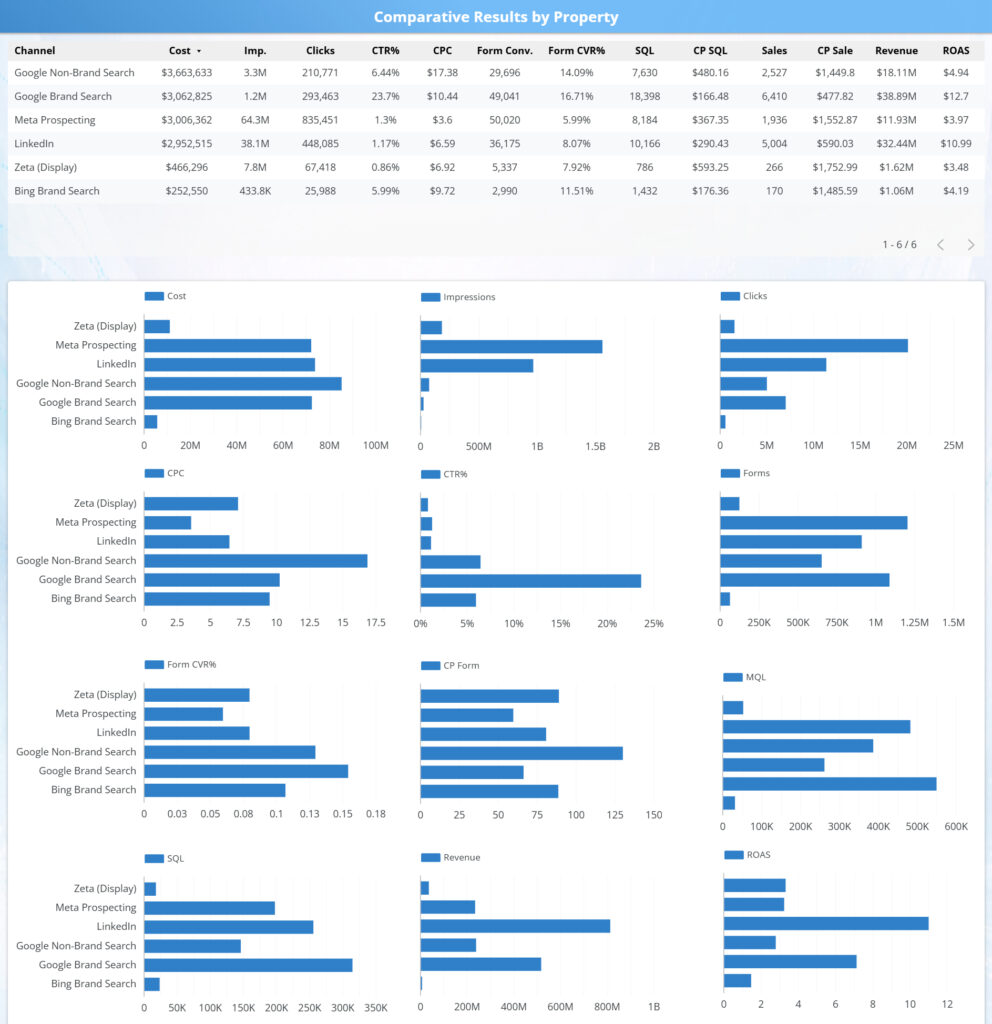 This table compares performance across channels from spend through revenue, aligning media efficiency with downstream CRM outcomes in a single view. It connects impressions, engagement, and conversion metrics directly to SQLs, sales, revenue, and ROAS, enabling clear cross channel comparison.