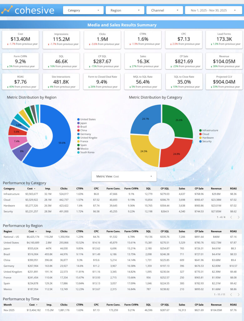 The layout highlights how media investments flow through impressions, clicks, leads, SQLs, and closed revenue, while supporting flexible slicing by category, geography, and channel to answer both strategic and tactical questions.