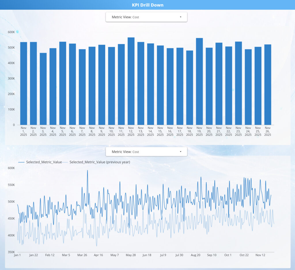 This Year-over-Year KPI Drill Down compares daily performance for a selected metric against the same period in the prior year. By overlaying current and previous-year values on a shared timeline, the view provides clear context for evaluating growth, efficiency, and seasonality beyond short-term fluctuations.