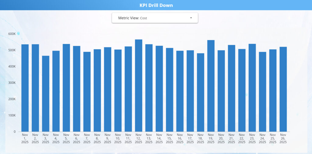 This KPI Drill Down chart provides a day-level view of performance for a selected metric, allowing users to move from aggregate trends into granular daily behavior. The metric selector enables quick switching across spend, volume, efficiency, and outcome KPIs, with the chart updating dynamically to reflect the chosen lens.