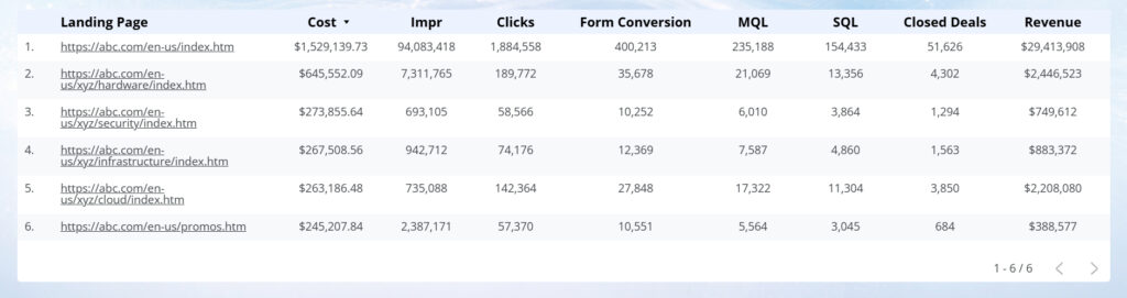 By consolidating volume, efficiency, and revenue metrics side by side, the table supports direct comparison across all active landing pages.